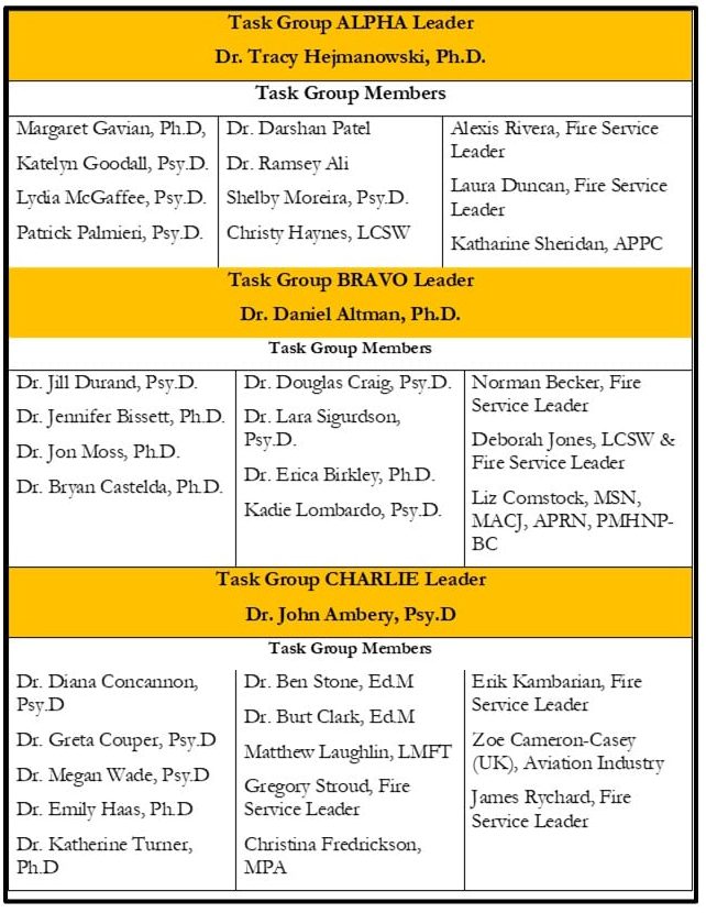 ● Task Group ALPHA: Develop Guidelines for Firefighter Mental & Behavioral Health Programs